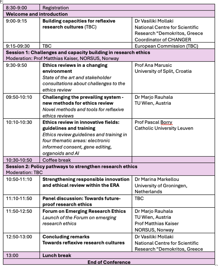 The CHANGER conference will run from 09:00 to 13:00 CET (registration from 08:30), and registration is free of charge. The CHANGER conference will bring together leading experts in research ethics, governance, and policy to reflect on the outcomes of the CHANGER project and to discuss how research systems can move beyond compliance-driven ethics review toward more reflexive and responsible research cultures. The event is aimed at researchers, research ethics committee members, Framework Programme ethics appraisal scheme experts, policy-makers, and all stakeholders interested in strengthening ethical reflection and responsibility in scientific research.