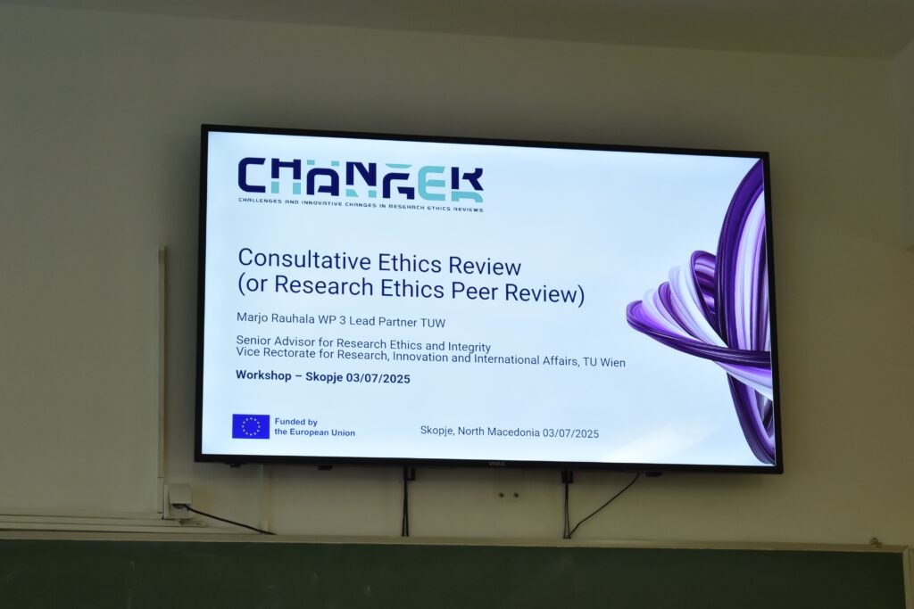 On 3 July 2025, Ljupcho Risteski, project partner from Ss. Cyril and Methodius University in Skopje, hosted a CHANGER workshop that marked a decisive step towards the establishment of an ethics review infrastructure at the University. The event gathered the Dean and faculty members, who were formally introduced to the CHANGER project by the project coordinator, Vasiliki Mollaki. A central highlight of the workshop was the presentation of the consultative ethics review by Marjo Rauhala, leader of WP3, which provided an innovative framework for institutionalising ethics review. This sparked an in-depth discussion on how such approaches could be strategically adopted to shape new, future-oriented ethics review processes within the University.